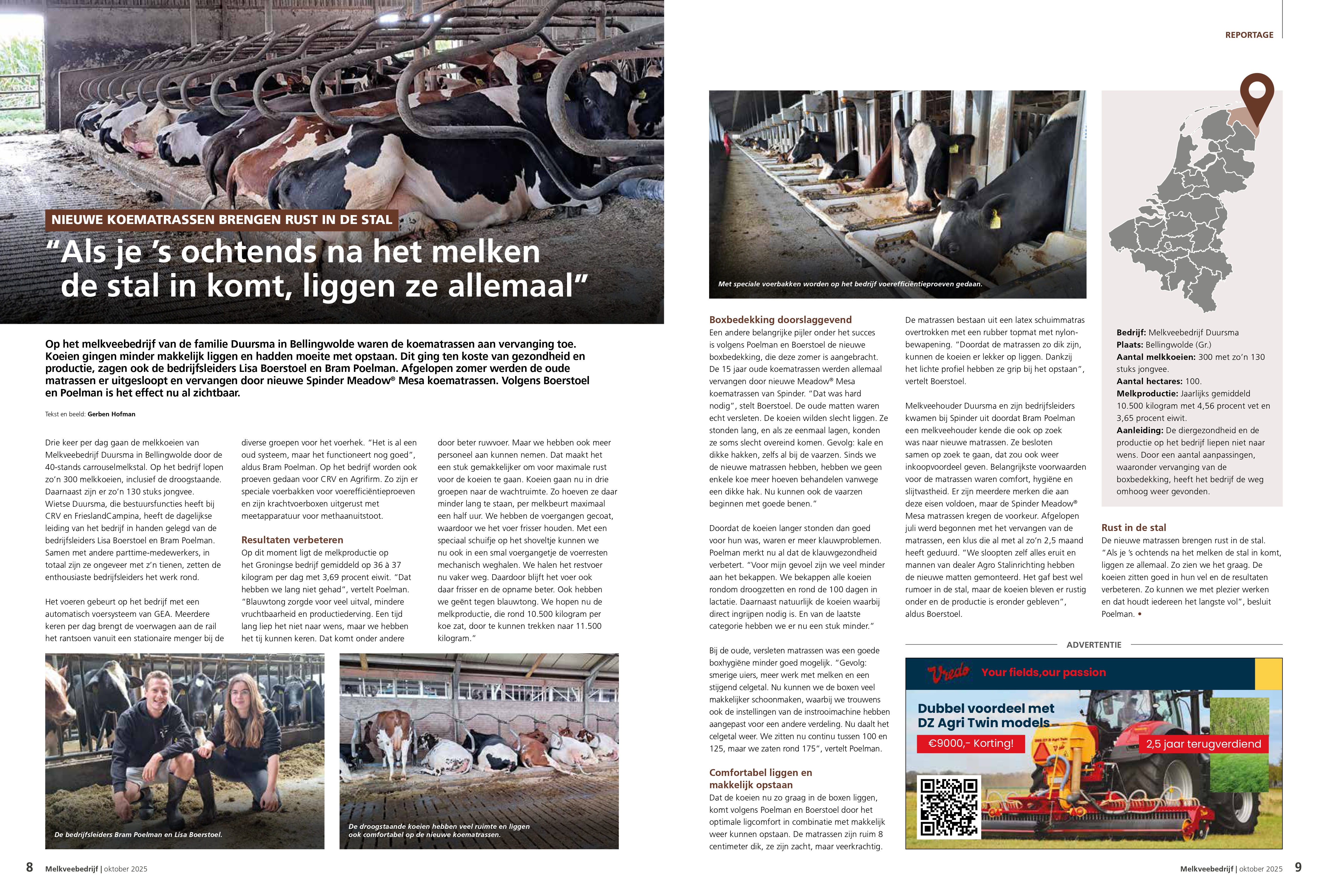 The new mattresses have brought peace to the barn. “When you walk in after morning milking, they’re all lying down. That’s exactly how we like to see it. The cows are happy and content, results are improving, we enjoy coming to work, and that’s what keeps everyone going the longest,” Poelman concludes.