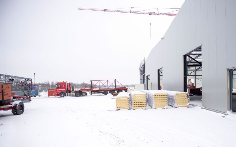 Even with the snow they just continued building and the fourth hall is almost sheltered. The office already takes shape.